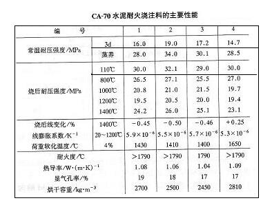 CA-70水泥的主要礦物相為CA2。它與CA-50水泥相比,其特點(diǎn)是水化速度慢,后期強(qiáng)度大和耐火度高。因此,采用CA-70水泥配置耐火澆注料,在常溫和超時(shí)條件下養(yǎng)護(hù),也表現(xiàn)為早期強(qiáng)度較低,后期強(qiáng)度較大。如在較高溫度下或采用蒸汽養(yǎng)護(hù),也可達(dá)到快硬高強(qiáng)的效果。另外,由CA2含量多,水化后形成的鋁膠也多,所以加熱后產(chǎn)生較多的活性氧化鋁并形成新礦物,有利于提高耐火澆注料的性能。