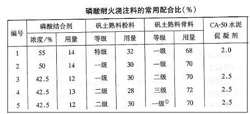 磷酸鹽耐火澆注料一般用粘土熟料或礬土骨料熟料作耐火骨料和粉料,其用量分別為65%~74%和24%~35%。常用配合比(見下表)。耐火骨料為粒徑小于15mm的統(tǒng)料,顆粒級配測定為15~5mm 50%,5~2.5mm 24%,小于2.5mm 26%。耐火粉料細度為小于0.09mm的大于80%。促凝劑為CA-50水泥,其用量視施工條件和常溫強度要求而定。一般用量為2%左右,環(huán)境溫度較低時,應適當增加用量,不要求常溫強度時可不加或少加CA-50水泥。