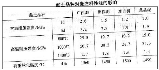 (表一) 粘土品種對(duì)澆注料性能的影響