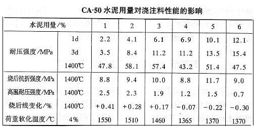 (表二) CA-50水泥用量對(duì)澆注料性能的影響