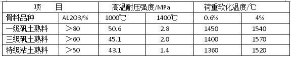 在黏土耐火澆注料中,耐火骨料起骨架作用,是其重要組成部分,占總料量的60%~70%。(下表三)為耐火骨料品種對(duì)澆注料性能的影響。表標(biāo)中看出,耐火骨料品種依AL2O3含量為據(jù),則隨AL2O3含量的增加,高溫耐壓強(qiáng)度提高,荷重軟化溫度開始點(diǎn)(變形0.6%)也提高,變形4%的荷重軟化溫度均大于1520℃,三級(jí)礬土熟料骨料略高些。因此,普通黏土耐火澆注料廣泛采用三級(jí)礬土熟料做耐火骨料,并取得了良好的使用效果。