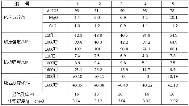 低水泥鋁鎂尖晶石質(zhì)耐火澆注料的組成材料,一般選擇高純或合成耐火原材料,科學(xué)級(jí)配,基質(zhì)優(yōu)化,用鋁酸鹽水泥CA-70或CA-80作結(jié)合劑,并摻加α-AL2O3 和 SiO2 超微粉和外加劑。按澆注料的配合比要求,準(zhǔn)確稱量各種材料,外加4.5%~5.8%的潔凈水,機(jī)械攪拌和振動(dòng)成型,自然養(yǎng)護(hù)到期后進(jìn)行烘干,然后做材料的理化性能檢驗(yàn),有代表的檢驗(yàn)結(jié)果(見下表).編號(hào)1~編號(hào)3用電熔白剛玉作耐火骨料和粉料:編號(hào)4和編號(hào)5分別用板狀剛玉和特級(jí)礬土熟料做耐火骨料,電熔白剛玉做耐火粉料:在耐火粉料中,均摻加了電熔鎂砂粉、高純鋁鎂尖晶石粉和α-AL2O3超微粉:在編號(hào)3~編號(hào)5料中,還摻加少量的SiO2 超微粉:結(jié)合劑用鋁酸鹽水泥CA-70,其用量為3%~5%:采用聚磷酸鹽做減水劑,其用量為0.14%~0.22%。當(dāng)鋁酸鹽水泥凝結(jié)過快而難以保證施工時(shí),應(yīng)摻加檸檬酸等緩凝劑:耐火骨料臨界顆粒的大小,依鋼包襯工作層厚度而定。耐火骨料與耐火粉料的質(zhì)量比約為7:3快干劑的用量,以試樣驟然放進(jìn)到550℃電爐中并保溫一定時(shí)間后取出,試樣無爆裂時(shí)為宜。