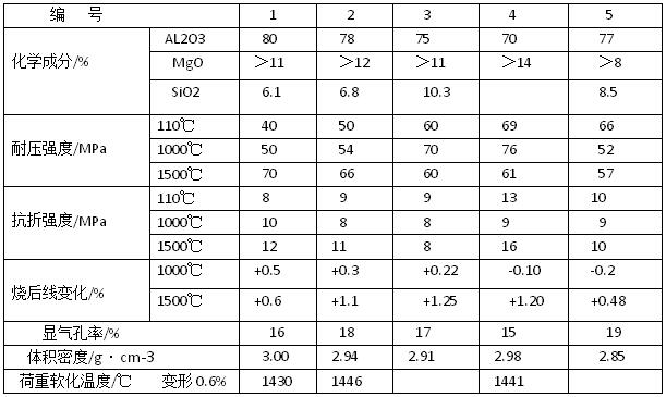 超微粉結(jié)合鋁鎂尖晶石質(zhì)耐火澆注料用的耐火骨料,主要是山西特級礬土熟料,AL2O3與TiO2合量約為90%,臨界粒徑約為25mm,一般采用連續(xù)顆粒級配,也有用間斷級配的:結(jié)合劑為活性SiO2超微粉,SiO2大于91%,中直徑D5O約為3μm,另加聚磷酸鈉等分散劑和快干劑。其性能見(下表);|(zhì)中均加較高檔次的鋁鎂尖晶石粉、剛玉粉和α-AL2O3超微粉。表中編號1添加電熔鎂砂粉,用量約為9%:編號2添加高純鎂砂粉,編號4添加MgO約為94%的燒結(jié)鎂砂粉,編號3、編號5和編號6則為中檔鎂砂粉。其細度均不大于0.088mm。