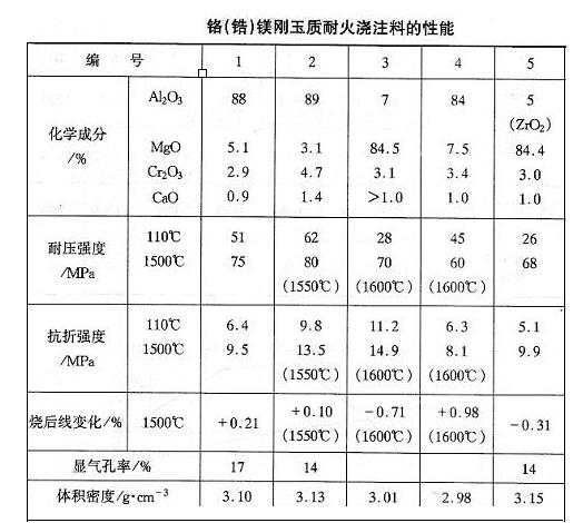(表)鉻(鋯)鎂剛玉質(zhì)耐火澆注料的性能