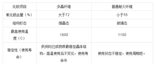 多晶莫來石纖維是由高熔點(diǎn)金屬氧化物微晶體組構(gòu)成的纖維,它與普通耐火纖維(玻璃纖維、礦棉、硅酸鋁纖維、高鋁纖維)的主要區(qū)別見表: