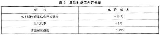 抽樣、驗(yàn)收按GB/T 10325 進(jìn)行。顯氣孔率、常溫耐壓強(qiáng)度、荷重軟化溫度為驗(yàn)收檢驗(yàn)項(xiàng)目。需要復(fù)檢時(shí),單值允許偏差應(yīng)符合表5的規(guī)定。