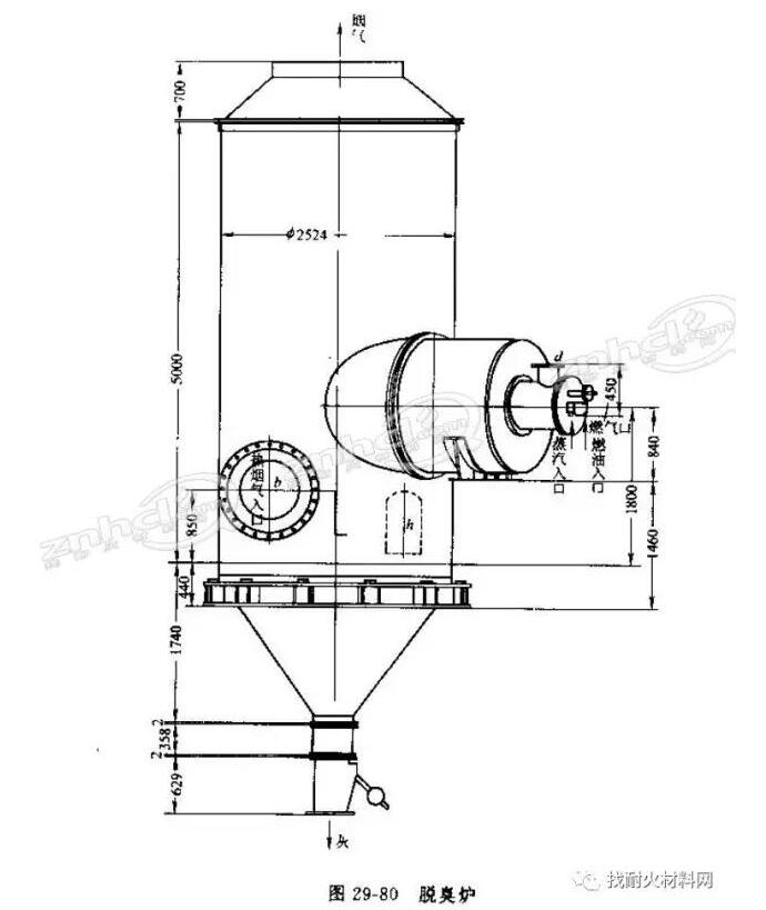 (3)脫臭爐,如圖29-80所示,筒體Φ2.5m×5m,襯里后內(nèi)徑為Φ2.1m,燃燒室直徑1.5m,爐膛溫度900℃。其襯里結(jié)構(gòu),筒體澆注二層耐熱澆注料襯里,內(nèi)層100mm厚輕質(zhì)耐熱澆注料,外層(工作層)100mm厚低鈣鋁酸鹽耐熱澆注料;錐頂高0.7m內(nèi)襯150mm輕質(zhì)耐熱澆注料;錐底高1.74m內(nèi)襯與筒體相同;燃燒室內(nèi)層為50mm厚蛭石一石棉板,外層(工作層)砌筑厚114mm高鋁磚(一級(jí).LZ-65)。