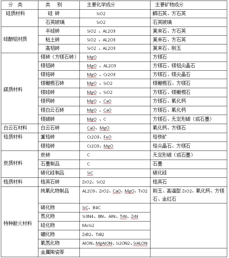 (4)按照化學(xué)礦物可分為:硅質(zhì)材料、硅酸鋁質(zhì)材料、鎂質(zhì)材料、白云石質(zhì)材料、鉻質(zhì)材料、炭質(zhì)材料、鋯質(zhì)材料、特種耐火材料。