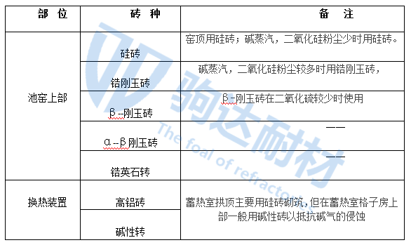 池窯砌體上有些部位,如鼓泡孔、窯坎、電極孔、檢查孔、測量孔等。它們有專門的用途,也有獨自的損毀特征。鼓泡孔磚會受到快速循環(huán)液流的強(qiáng)烈磨損蝕損。鼓泡孔磚內(nèi)外表面的較大溫差會產(chǎn)生大的機(jī)械應(yīng)力,易導(dǎo)致裂損。窯坎磚亦會遭到劇烈高溫液流的損毀。這兩種磚均可采用氧化法生產(chǎn)的無縮孔含ZrO241%的電熔鋯剛玉磚。電極孔磚因受到電極周圍循環(huán)液流的強(qiáng)烈侵蝕,還由于電極冷卻引起磚內(nèi)大的溫差,產(chǎn)生大的機(jī)械應(yīng)力,導(dǎo)致磚孔周圍出現(xiàn)輻射狀裂紋。故要求磚材耐侵蝕、耐磨性,還要有一定的抗熱振性和較高的電阻。選擇材質(zhì)時除考慮其電性能外,還要考慮玻璃液的導(dǎo)電性和電極布置方式。一般采用氧化法生產(chǎn)的無縮孔含ZrO241%的電熔鋯剛玉磚,該材質(zhì)的抗熱振性較差,可考慮改用熔融石英磚或燒結(jié)法生產(chǎn)的致密鋯質(zhì)磚。測量孔、檢查孔受到窯內(nèi)溢出火焰長期的沖刷,易被燒損和開裂,常用定制含ZrO241%的電熔鋯剛玉磚。玻璃池窯不與玻璃液接觸的部位,如上部結(jié)構(gòu)的窯頂、窯墻和噴火口、裝料系統(tǒng)等,損毀是高溫作用、粉塵沖刷和各種揮發(fā)物的化學(xué)侵蝕。揮發(fā)物來源于玻璃液、配合料和燃燒產(chǎn)物。主要成分是堿金屬氧化物、硼化物還有氟化物、氯化物和硫的化合物等。這些揮發(fā)物在高溫下以堿蒸汽的狀態(tài)存在,溫度低時又冷凝成液相。池窯上部、換熱裝置用耐火材料見下表。