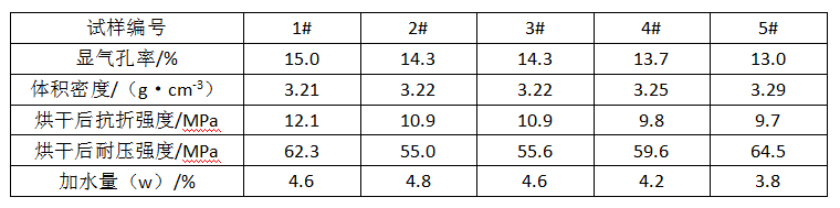 當(dāng)選用α-Al2O3微粉c,加入量(w)為3%~6%時,配料用水量相同,并且試樣的物理指標(biāo)也在目標(biāo)值內(nèi)。