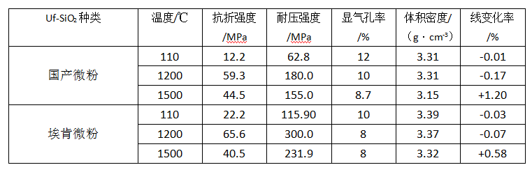 本實驗選用國產(chǎn)微粉和埃肯微粉作對比試驗,國產(chǎn)uf-SiO2配料用水量3.5%(w),?蟯f-SiO2配料用水量3.3%(w)。澆注料的物理性能見表2?梢钥闯,要達到相近的流動性,用國產(chǎn)的uf-SiO2時,施工用水量多于用埃肯uf-SiO2的用水量,試驗的各相物理指標(biāo)都不如用進口微粉的試樣。更為嚴重的是,因為國產(chǎn)微粉雜質(zhì)含量高,1500℃燒后試樣外觀規(guī)整。為了制得質(zhì)量優(yōu)良的預(yù)制塊,決定采用?系膗f-SiO2。