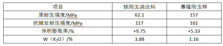 棕剛玉澆注料的抗渣結(jié)果為:切開坩堝,無明顯的浸蝕滲透現(xiàn)象。從抗堿試驗來看,剛玉莫來石完全潰散,無一完整的?寺傆駱优c棕剛玉澆注料試樣完整無裂紋,其抗堿性試驗結(jié)果見表4。棕剛玉澆注料有較好的抗堿性能,但與塞隆剛玉樣相比,抗渣試驗后體積膨脹較大,吸收的K2O也較好。