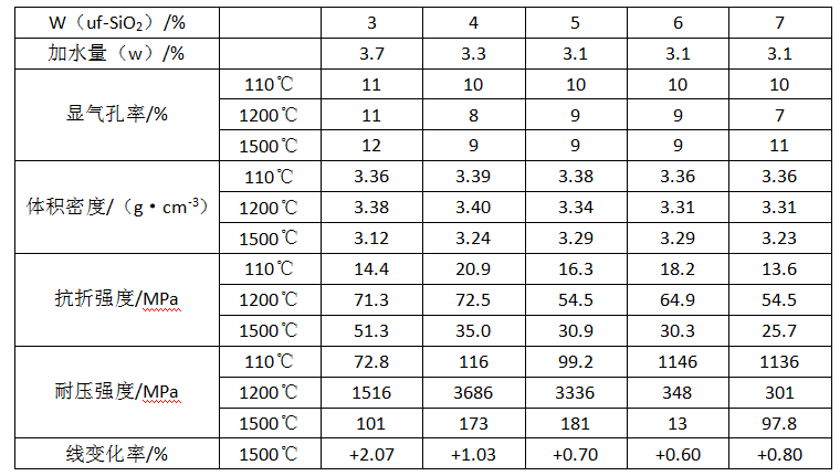試驗選用?衔⒎鄣募尤肓浚╳)為3%、4%、5%、6%、7%做對比試驗,試驗結(jié)果列與表3。由表3可以看出,當(dāng)uf-SiO2加入量為3%~4%(w)時,施工用水量較大,燒后線變化也較大,當(dāng)加入量為5%~7%(w)時,施工用水量較小,各項指標(biāo)也在目標(biāo)值內(nèi)。