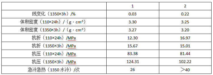 將以上2組材料的熱膨脹性線變化、體積密度、 抗折、抗壓和急冷急熱性能進(jìn)行測(cè)定得以下數(shù)據(jù),見(jiàn)表2。