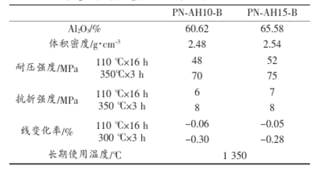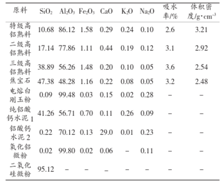 以特級、二級、三級高鋁熟料及焦寶石為主要原材料,加入硅微粉,以鋁酸鈣水泥為結(jié)合劑,以磷酸鹽為減水劑。固定硅微粉、水泥及磷酸鹽減水劑的加入量,研究澆注料的不同氧化鋁含量與荷重軟化開始溫度、體積密度、導熱系數(shù)的關系。表2為主要原材料的理化指標。