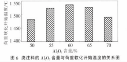 澆注料氧化鋁含量與體積密度、導熱系數(shù)的關系見圖5。澆注料氧化鋁含量與荷重軟化開始溫度的關系見圖6。荷重軟化開始溫度檢測標準YB/T 370-1995,實驗條件為1350℃x3h燒后。