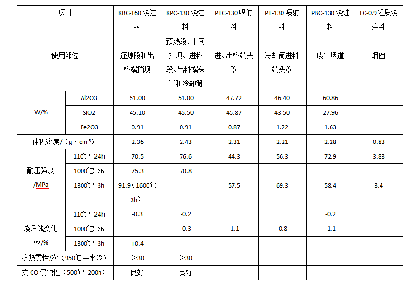 1:直接還原煉鐵回轉(zhuǎn)窯用澆注料的性能