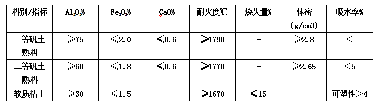根據(jù)理論和實踐,采用一、二等高鋁礬土加入少量軟質(zhì)粘土,能制得荷重軟化溫度和耐壓強(qiáng)度均較高的制品,并能提高制品的成型和燒結(jié)性能。原料技術(shù)指標(biāo)如表1: