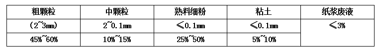 結(jié)合劑采用軟質(zhì)粘土和紙漿廢液,有利于成型。根據(jù)最緊密堆積原理,采用“兩頭大、中間小”的配料原則,為提高制品的高溫強(qiáng)度及高耐磨性,故適當(dāng)增加粗細(xì)顆粒的加入量。根據(jù)實際情況及窯用試驗,采用表2中的級配: