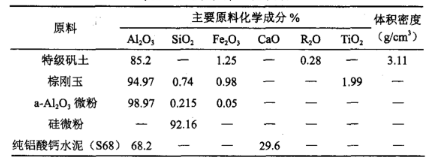 由于SiO2含量較高的材料容易與鋁及鋁合金發(fā)生反應,對這類耐火才老侵蝕嚴重,因此選用了Al2O3含量較高的一批材料,以提高澆注料的抗鋁水滲透能力。實驗主要原料:優(yōu)質(zhì)特級礬土、棕剛玉、α-Al2O3微粉、硅微粉、鋁酸鈣水泥、外加劑等。