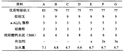 為了考證不同組分對耐火澆注料理化指標的影響,進行了大量的實驗,這里只列舉了以下具有一定代表性的幾組配方進行說明,每組配方中骨料基質(zhì)配比為70:3。