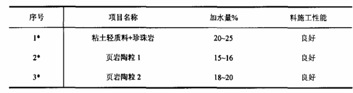 實(shí)驗(yàn)過程選用多孔粘土熟料、頁巖陶粒、珍珠巖和SiO2超細(xì)粉等為原料,礬土水泥為結(jié)合劑,減水劑選用三聚磷酸鈉、六偏磷酸鈉及有機(jī)結(jié)合劑等。通過多組配比,進(jìn)行對比試驗(yàn),分別檢驗(yàn)澆注料的加水量、施工性能,以及不同溫度下的耐壓強(qiáng)度、體積密度和導(dǎo)熱系數(shù)等指標(biāo),通過對比確定出最佳方案。