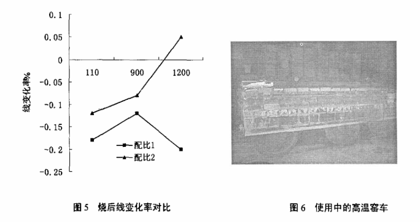 使用溫度下澆注料的燒后線變化率,決定了澆注料使用中收縮裂紋的問題,也是窯車使用壽命高低的重要影響因素之一。通過多孔粘土熟料(配比1)與頁巖陶粒(配比2)的對比試驗(yàn)發(fā)現(xiàn),用頁巖陶粒配置的澆注料,不但強(qiáng)度高,隔熱保溫性能好的特點(diǎn),而且燒后收縮小,這是由于頁巖陶粒加熱時有二次微膨脹的緣故。結(jié)果見圖5。