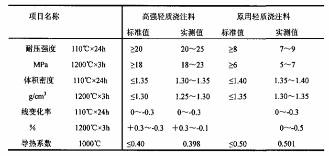 高強(qiáng)輕質(zhì)澆注料理化指標(biāo)研制的高強(qiáng)輕質(zhì)澆注料理化性能與曾試用過的輕質(zhì)澆注料理化性能進(jìn)行了對比見表6。