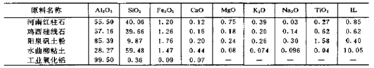 采用紅柱石粗精礦、硅線石、特級礬土粉、軟質(zhì)粘土、工業(yè)氧化鋁為主要原料,其化學(xué)組成如表1所示。