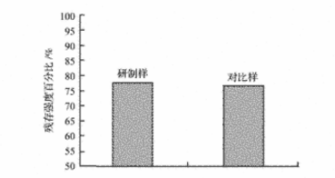 抗熱震性試驗(yàn)是將經(jīng)過1400℃保溫3h燒成后的長條試樣(40mmx40mmx160mm)冷卻至室溫后,置于已升溫到1100℃并保溫20min的硅鉬棒高溫爐中。保溫20min后,立即從爐中取出并浸入冷水中保持5min。如此反復(fù)急冷急熱10次。然后將熱展后的試樣干燥,測定其殘余的常溫抗折強(qiáng)度。計算出殘余抗折強(qiáng)度保持率,以此來判定熱震穩(wěn)定性的好壞,殘余抗祈強(qiáng)度保持率越高熱震性越好。