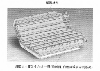 圖8為2011年1月10日檢修時(shí),使用1年后的情況。可以看出局部發(fā)生剝落,主要集中在低溫方向這一排(圖中白色粗線所示位置),但是剝落層只有預(yù)制件的1/3厚度,對(duì)整體效果沒(méi)有影響。此問(wèn)題我們已與通達(dá)公司進(jìn)行溝通,其也給出了指導(dǎo)性意見(jiàn):① 安裝過(guò)程當(dāng)中嚴(yán)格控制每塊預(yù)制件之間的間隙在10mm,其中鑲嵌耐磨陶瓷纖維毯,并用火泥進(jìn)行填塞;②在保溫材料處理過(guò)程當(dāng)中用塑料布把預(yù)制件和注料、保溫材料進(jìn)行隔離,以防止水分進(jìn)入到預(yù)制件中,在升溫過(guò)程中影響使用效果。