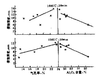 圖1 1500℃、1600℃時(shí)保溫30min的氣孔率,Al2O3含量與侵蝕深度的關(guān)系