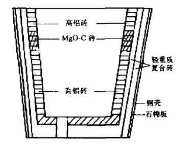 使用試驗(yàn)在大冶鋼廠四煉鋼60t精煉包上進(jìn)行。鋼包外殼為Φ2700~Φ2970mm的圓錐體。工作襯渣線部位用MgO-C磚,鋼液部位用高鋁磚,有時(shí)也使用全MgO-C工作襯。復(fù)合保溫耐火磚襯砌于工作襯與鋼殼之間,代替原用的粘土質(zhì)永久襯,其軔筑情況見圖7。