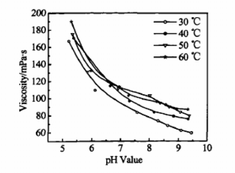 由圖1還可以看出,在pH值相同的條件下,溫度越高,料漿的粘度越大。盡管具體原因有待進(jìn)一步深入探討,但主要的影響因素可能有: