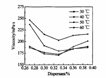 同時(shí)可以看出,在堿性條件下(料漿pH=9),30,40℃時(shí)分散劑對(duì)料漿粘度的影響較大,而50,60℃時(shí)分散劑對(duì)料漿粘度的影響較小,曲線較為平緩,表明高溫下由于聚合作用的發(fā)生,分散劑的作用明顯減小。