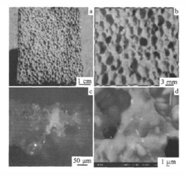 取球料比為4:1的樣品進(jìn)行結(jié)構(gòu)分析。燒成后材料呈淺黃色,沒有明顯缺陷和大的氣孔?妆诒∪缦s翼,肉眼已無法判斷其厚度(圖3a)。孔洞與孔洞之間絕大多數(shù)互不連通,只有少數(shù)孔壁有孔,使相鄰孔洞連通(圖3b),這表明盡管孔壁很薄,但孔壁的分布十分均勻,材料組織結(jié)構(gòu)比較均勻。在光學(xué)顯微鏡下(圖3c),制品的孔壁最薄處200~300um,三孔交界處300〜400um。在電子顯微鏡下觀察(圖3d),孔壁上晶粒細(xì)小,直徑在2~4um,結(jié)合緊密,孔壁上還有一些封閉氣孔?梢哉J(rèn)為這些氣孔應(yīng)該是基質(zhì)中的結(jié)合劑燒失后留下的氣孔,在高溫下強(qiáng)化燒結(jié)并進(jìn)一步封閉形成的。
