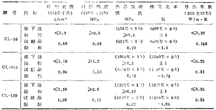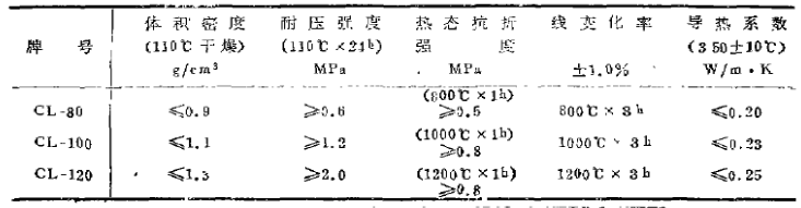 日本牌號GL-80、CL-100, CL-120輕質(zhì)隔熱澆注料具有容重小,高溫下線變化率低,抗折強度高,導(dǎo)熱系數(shù)小等特點,其技術(shù)指標(biāo)見表1。