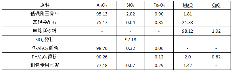 試驗采用低碳剛玉、鎂砂和富鋁尖晶石為主要原料,因材料要求具有優(yōu)良的抗渣侵蝕性、抗渣滲透性和抗剝落性,所以采用超微粉和鋼包專用水泥結合。為滿足所需材料的各種理化性能指標,保證其使用效果,確定原料最佳的臨界粒度為8mm。試驗用各種原料及化學組成見表1,試驗用不同鋼廠精煉渣化學成分見表2,試樣的配料組成見表3。
