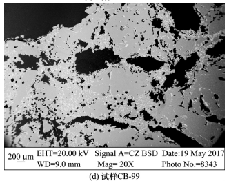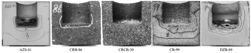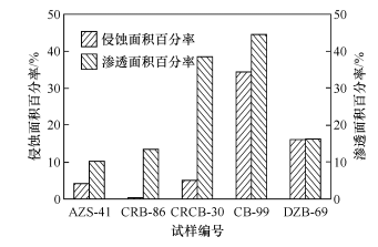 由圖2可以看出:AZS-41和CRB-86的侵蝕面積百分率和滲透面積百分率都很小,表明兩種制品的抗飛灰侵蝕性和滲透性均很好;CB-99的侵蝕面積百分率和滲透面積百分率都最大,表明其抗飛灰侵蝕性和抗飛灰滲透性均最差;DZB-69的侵蝕面積百分率和滲透面積百分率均介于AZS-41和CB-99之間,表明其抗飛灰侵蝕性和滲透性均介于AZS-41和CB-99之間;CRCB-30的侵蝕面積百分率與AZS-41的相近,但其滲透面積百分率則與CB-99的相近,這表明CRCB-30的抗飛灰侵蝕性很好,但抗飛灰滲透性很差。歸納起來,各試驗磚的抗飛灰侵蝕性由好到差的排列順序為CRB-86>AZS-41>CRCB-30>DZB-69>CB-99,而抗飛灰滲透性由好到差的排列順序為AZS-41>CRB-86>DZB-69>CRCB-30>CB-99。