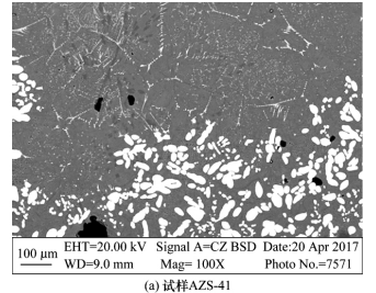 熔鑄鋯剛玉磚AZS-41結(jié)構(gòu)致密,顯氣孔率僅為0.90%,熔融飛灰借以滲入的孔隙通道少,因此其抗飛灰滲透性非常好。ZrO2晶?骨治g性能優(yōu)良,不與熔渣發(fā)生反應(yīng)。工作面處的Al2O3和SiO2則被全部熔蝕,生成玻璃相,致使工作面處組織結(jié)構(gòu)被完全破壞。這表明,熔融鋯剛玉制品雖然具有良好的抗飛灰玻璃滲透性能,但其抗侵蝕性能差。