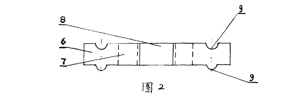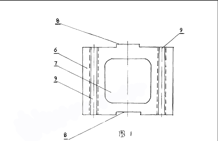 圖1、2中,6—專用異型耐火磚的整體,7-異型磚整體6上的中心通孔,8—異型磚整體6外側(cè)面的凹槽、凸起,9—異型磚整體6上、下表面的凹槽、凸起。本實例在使用時可由數(shù)個專用異型磚的整休6通過其外側(cè)面的凹糟、凸起8相亙咬合物成導(dǎo)風(fēng) 墻4 (附圖3中)的一層,再由若干專用異型磚的整體6通過其上、下表面的凹槽、凸起相互4合砌成導(dǎo)風(fēng)墻4 (附圖3中)的若干層,這樣就徹筑成有數(shù)個導(dǎo)風(fēng)孔的堅爐導(dǎo)風(fēng)墻。