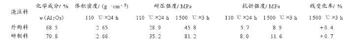 根據(jù)澆注料研究的內容以及選擇的原材料,首先進行了澆注料的配方設計,通過實驗室的配方調整,獲得了抗熱震性與防爆性較好的澆注料配方,并采用外購料與研制料分別制備40mm×40mm×160mm的試樣進行力學性能對比檢測。由試樣的成型過程可知,研制的澆注料粘度比外購料稍大,振動返漿時間稍長。表2為研制的耐火澆注料與外購澆注料的理化性能檢測結果。同時在實驗室中進行了兩種澆注料的1100℃水冷熱震對比試驗,對比試驗結果為外購料的熱震循環(huán)13次時,試樣表面出現(xiàn)微裂紋,45次時試樣已有大塊剝落,研制料試樣則在15次時表面出現(xiàn)裂紋,62次時出現(xiàn)與外購料同樣的剝落狀況。