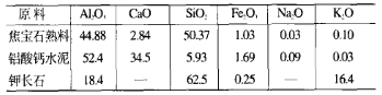以山西的焦寶石熟料為骨料,采用的是五級(jí)粒度級(jí)配,即8~5mm、3~1mm、1~0mm及細(xì)粉,并加入鉀長(zhǎng)石、瓷粉等外加物,結(jié)合劑是C-50鋁酸鈣水泥,主要原料的化學(xué)組成見(jiàn)表1。