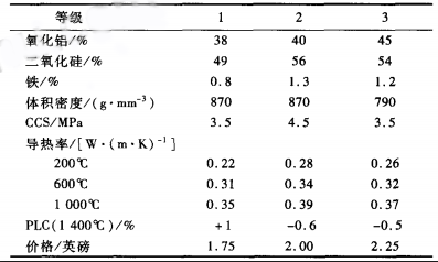 表2列出了3種隔熱磚類(lèi)型。3類(lèi)磚氧化鋁含量高,鐵含量低,密度小,看起來(lái)是最好的磚。1類(lèi)和2類(lèi)磚含量?jī)H差2%,密度相同,1類(lèi)磚導(dǎo)熱性較低。1類(lèi)磚的PLC為+1%。