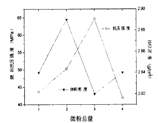 對于微粉的加入量,自流澆注料也有一個最佳指標(biāo),如圖2所示,微粉含量過低,強度與密度都不高,超過一定的值后,微粉含量增加,強度下降,體積密度增加。從體積密度和抗壓強度的角度綜合考慮,微粉含量需要保持在一個合適的范圍。