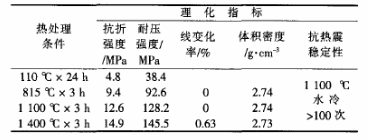 試樣常溫成型固化后經(jīng)不同溫度熱處理后的強度、體積密度和線變化率見表1。