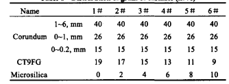 實(shí)驗(yàn)中所用原料為:板狀氧化鋁、硅微粉、高鋁水泥。這里通過硅微粉加入量的變化來反應(yīng)顆粒尺寸分布的變化。澆注料的配料如表1所示。