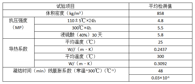 新型輕質(zhì)耐酸澆注料經(jīng)現(xiàn)場要求取原材料樣品進(jìn)行性能測試,結(jié)果如下