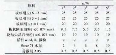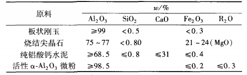 以板剛玉顆粒(6~3、3~1、≤1mm)為骨料,板狀剛玉粉(≤0.074mm)、燒結尖晶石粉(≤0.074mm)、活性α-Al2O3微粉為細粉,純鋁酸鈣水泥為結合劑,聚丙烯纖維、偶氮甲酰胺、碳酸氫鈉及復合防爆劑聚丙烯纖維+碳酸氫鈉等為防爆劑。原料的化學組成見表1。