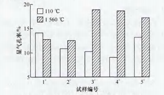將1560℃燒后試樣經1100℃水冷3次后,測量其殘余抗折強度并計算其強度保持率,以此來評價試樣的抗熱震性。